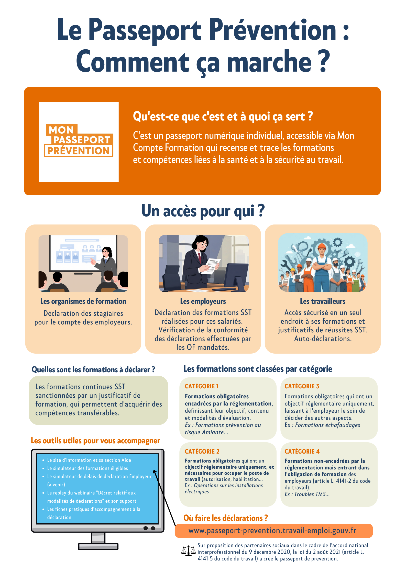 Le Passeport Prévention est un passeport numérique qui recense et trace les formations et compétences liées à la santé au travail. Il est accessible via mon Compte Formation par les organismes de formation, les employeurs, les salariés. Il porte sur les formations SST classées dans 4 catégories.